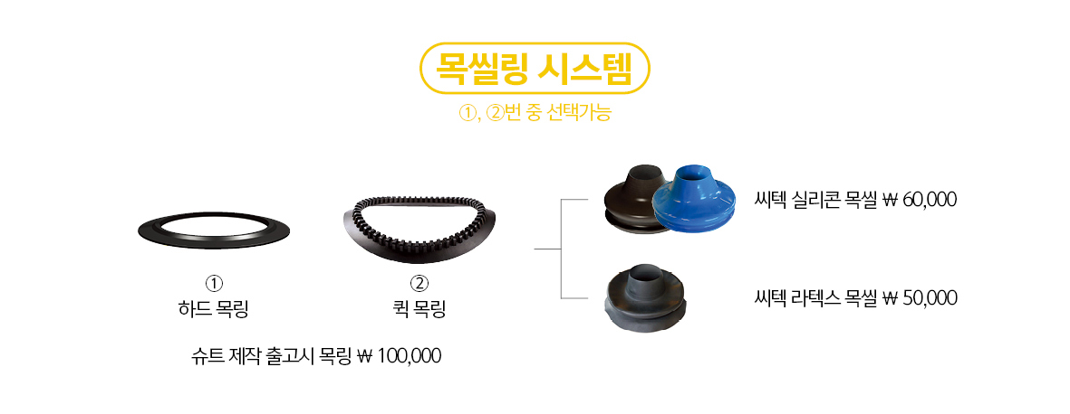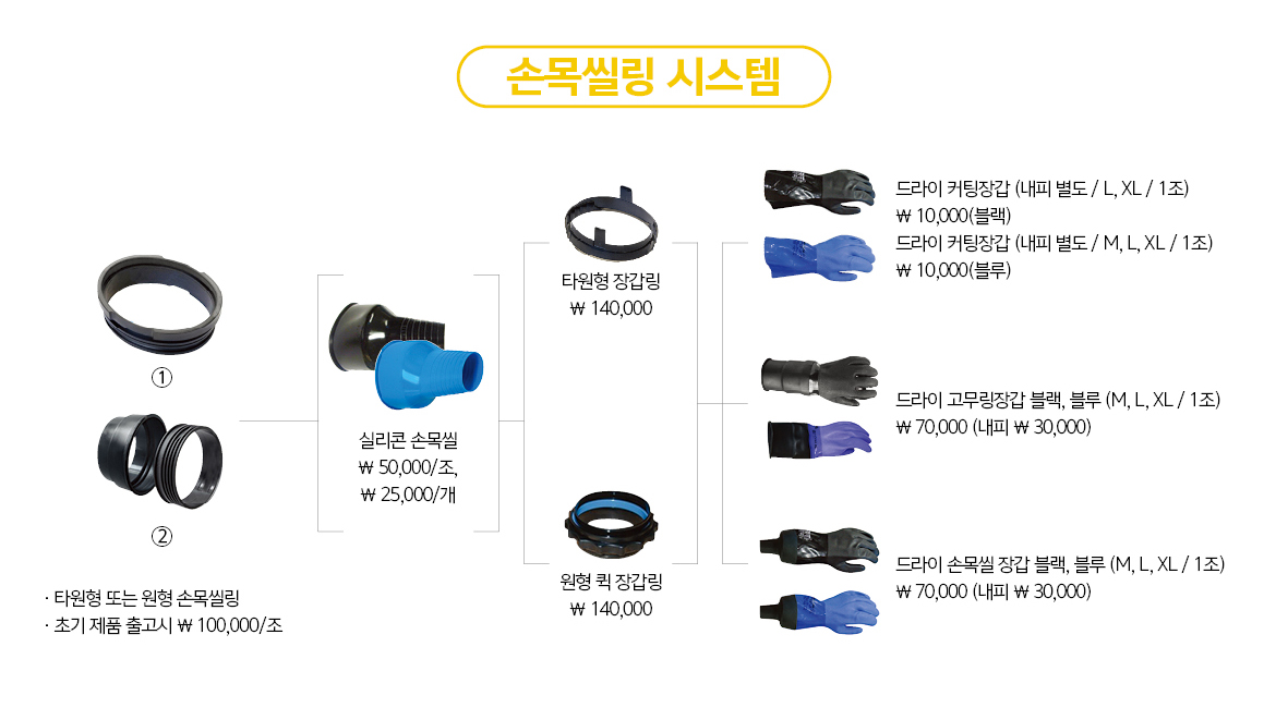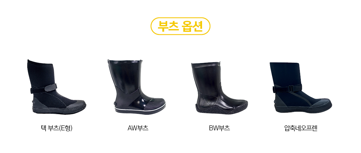(자재 : 목 씰, 손목 씰, 지퍼, 흡기밸브, 배기밸브, 부츠, 서스펜더, 크로치 스트랩)